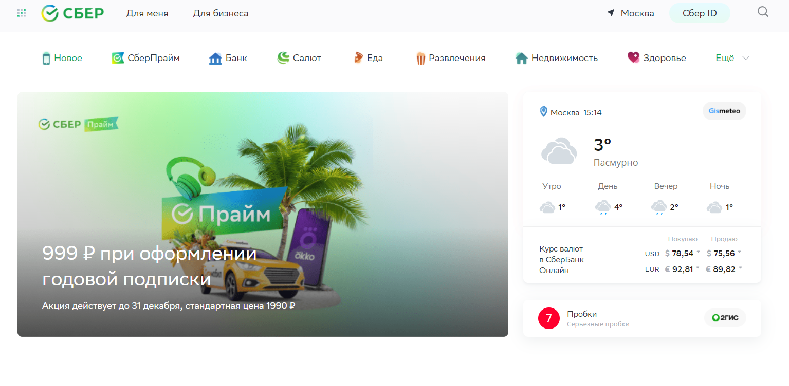 Поэтому я посмотрел на сайт «Сбера» (именно «Сбера», у «Сбербанка» есть отдельный сайт»). Тут все как надо — и голосовой помощник, и еда, и развлечения, и здоровье, и погода (которая в последнее время не радует). Наверное, всем было бы удобнее иметь это в виде мобильного приложения (на что было бы интересно посмотреть).