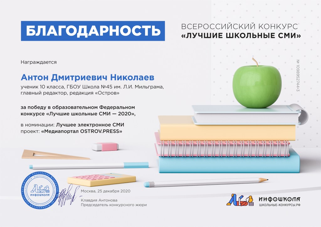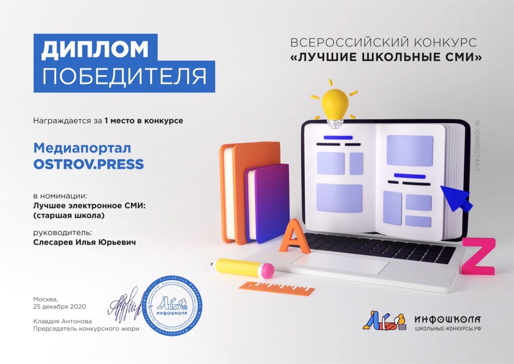 Однако, осенью история с дистанционным обучением повторилась. Но все было немножко по-другому. С одной стороны, дистанционное обучение было уже известно и испытано, поэтому было как-то спокойнее и привычнее. С другой стороны, за весну большинство возненавидело занятия дома, и повторное возвращение расстроило их еще больше. Все же, этот период был в разы легче, ведь не обязательно было сидеть дома все свое время. К тому же проходили мероприятия «Острова». Дважды был показан спектакль «Королевские игры», состоялся Бардовский концерт. Подводя итоги, стоит еще раз упомянуть медиапортал OSTROV.PRESS, который в этом году достиг очень многого, а именно, сайт посетили 4234 раза, 9921 раз пользователи переходили к прочтению различных статей и наконец, OSTROV.PRESS победил в номинации «Лучшее электронное СМИ (старшая школа)» среди всех российских школ.