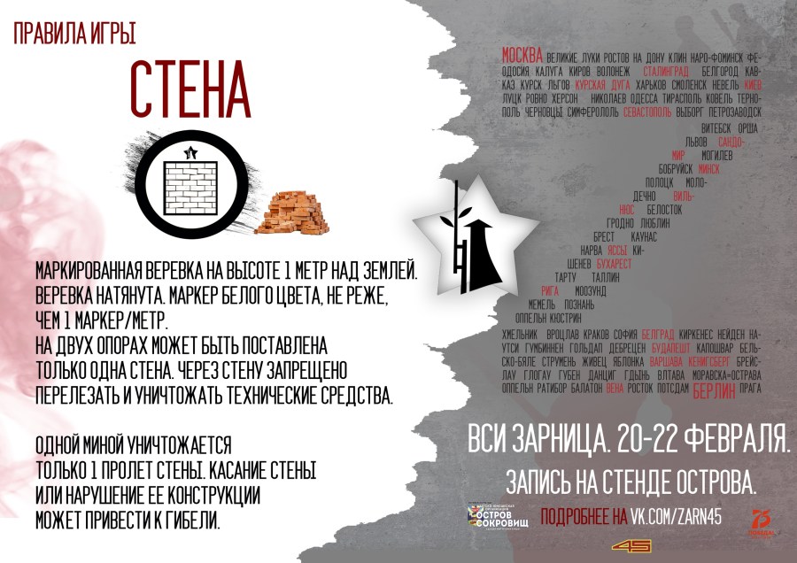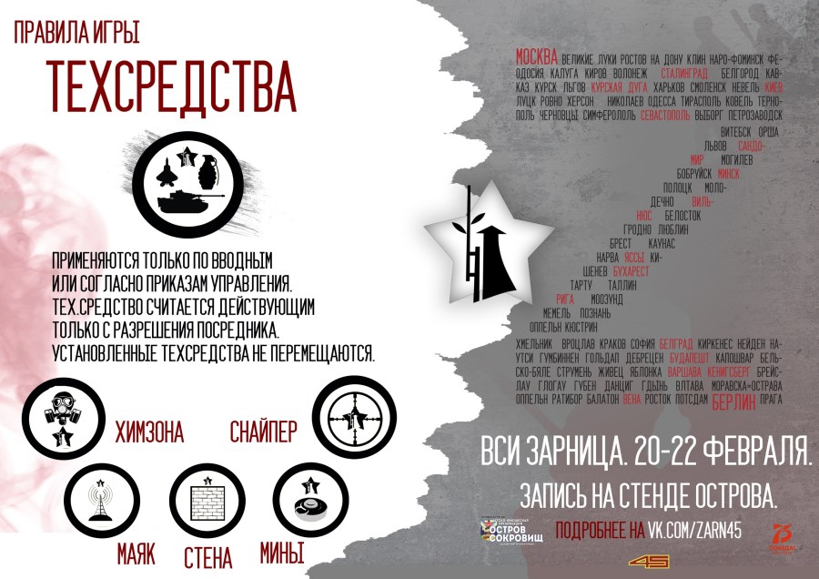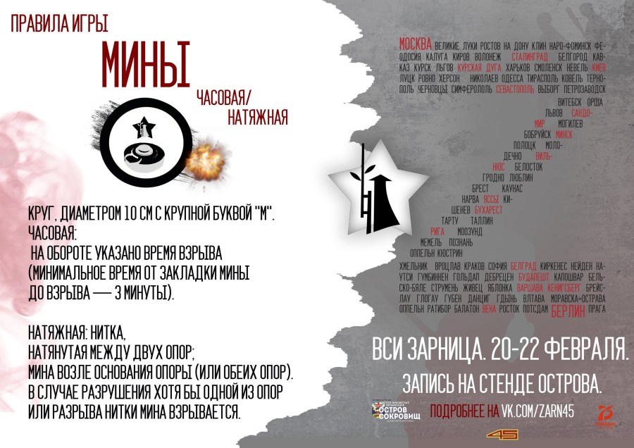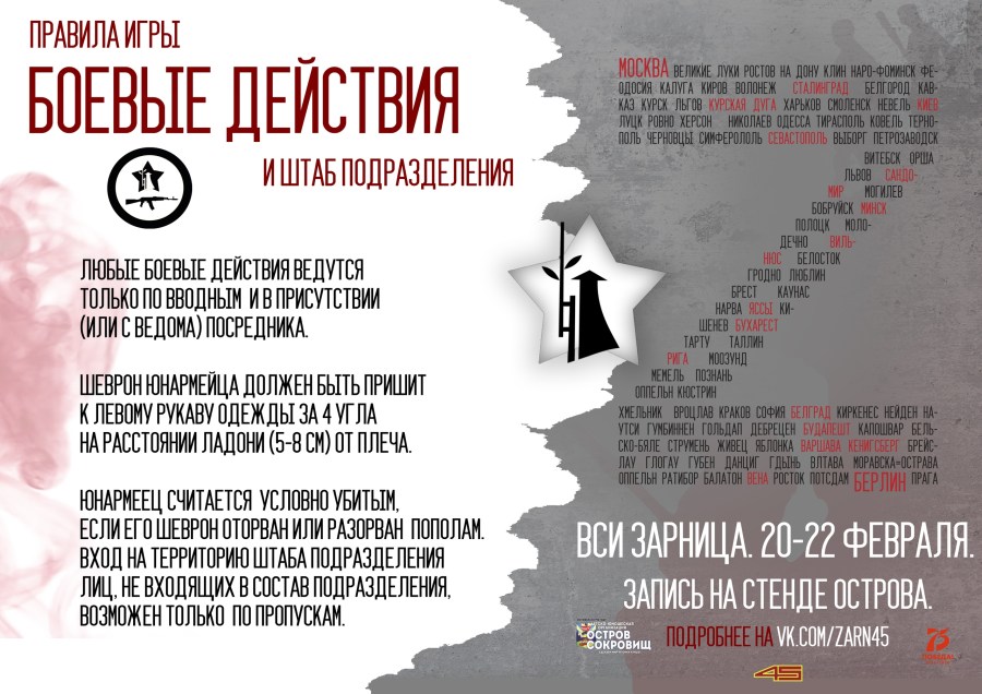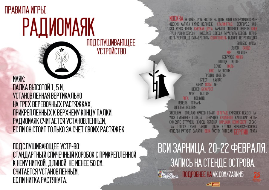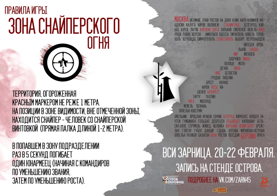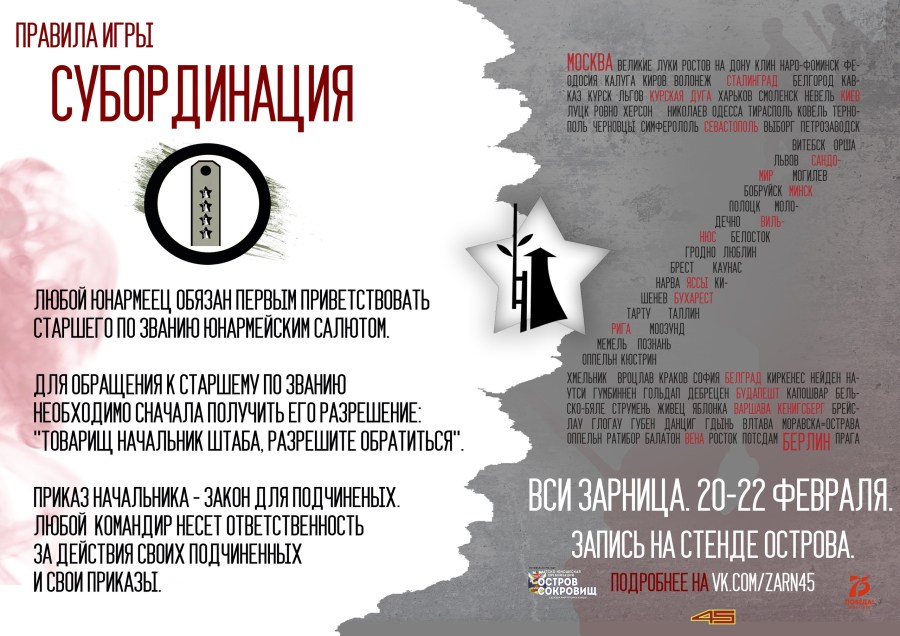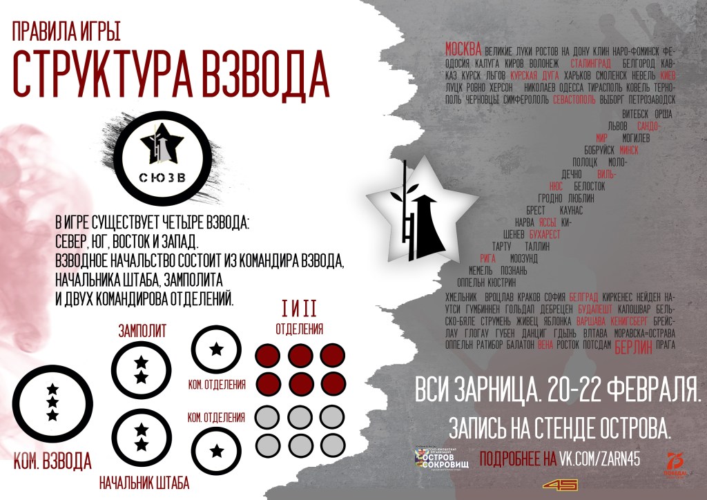 В итоге, хотелось бы еще раз напомнить про Зарницу в этом году. Времени до конца регистрации остается все меньше и меньше, так что поторопитесь принять участие в самом масштабном мероприятии Острова Сокровищ (https://vk.com/zarn45 — ссылка на сообщество Зарницы во Вконтакте)
