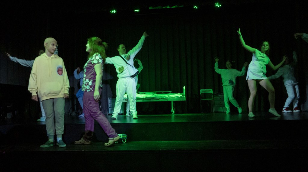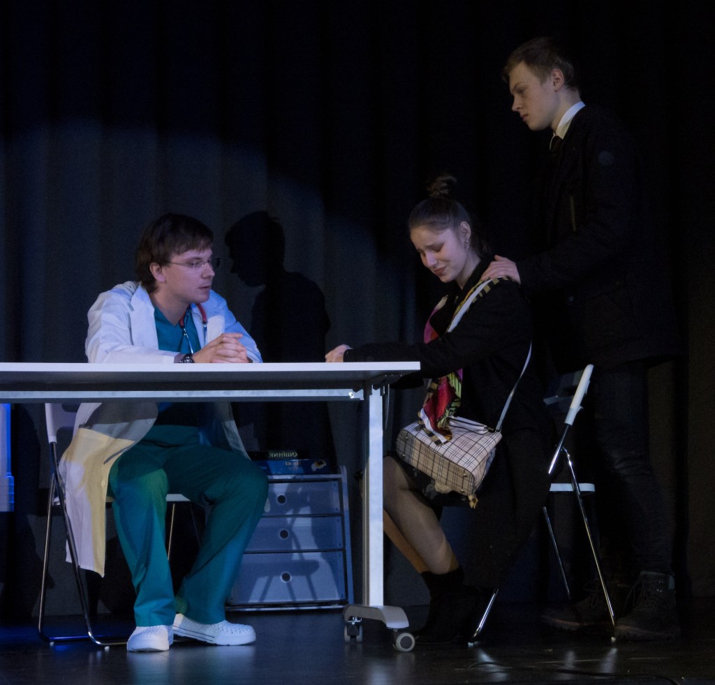 Перейдем к работе и показу. Начать стоит с того, что сценарий написан Виталиком [Виталием Викторовичем Лебедевым], поэтому там иногда сразу встречаются просто невероятно смешные вещи, чего только стоят сцены родителей с доктором, просто почитайте, вслушайтесь. Из-за этого период первой работы с текстом я бы назвала привыканием, потому что до полного «привыкания» начать было абсолютно невозможно. Что касается работы, я очень полюбила этот спектакль, честно. Мне легко и понятно работать с Леной, я как будто снова в своём шестом классе, меня очень заряжали ребята. Отдельно я хочу отметить, конечно, Серёжу Иванова, с которым я провожу все время на сцене, а значит, с которым я провела этот год в максимально плотном взаимодействии. Несмотря на Серёжин переходный возраст, который иногда дает о себе знать (чего стоят танцы), он удивительно талантливый, работоспособный, искренний и живой на сцене. Серёжа, если ты это вдруг читаешь, с тобой было очень здорово работать!