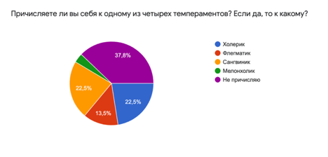 Я думаю, многие знакомы с теорий четырех темпераментов, придуманной еще Гиппократом. Она делит людей на четыре типа: холериков, флегматиков, меланхоликов и сангвиников. По нашей диаграмме можно точно сказать, что большая часть островитян, 62,2% ознакомлена с данной теорией, а точнее причисляют себя к одному из типов. Холерики и Сангвиники заняли равные позиции, 22,5% чуть меньше оказалось флегматиков, 13,5% и почти отсутствуют меланхолики, 3,6%.