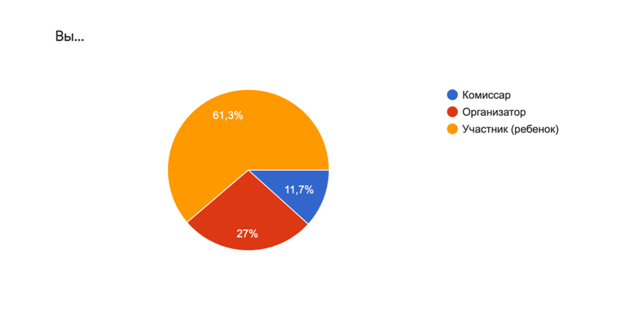 На первой диаграмме видно, как соотносится количество участников, организаторов и комиссаров. Участников, несомненно, больше всего, 61,5%. Островские мероприятия – это всегда весело, круто и познавательно в особенности для участников, как минимум, потому что они просто принимают участие и искренне наслаждаются процессом.
