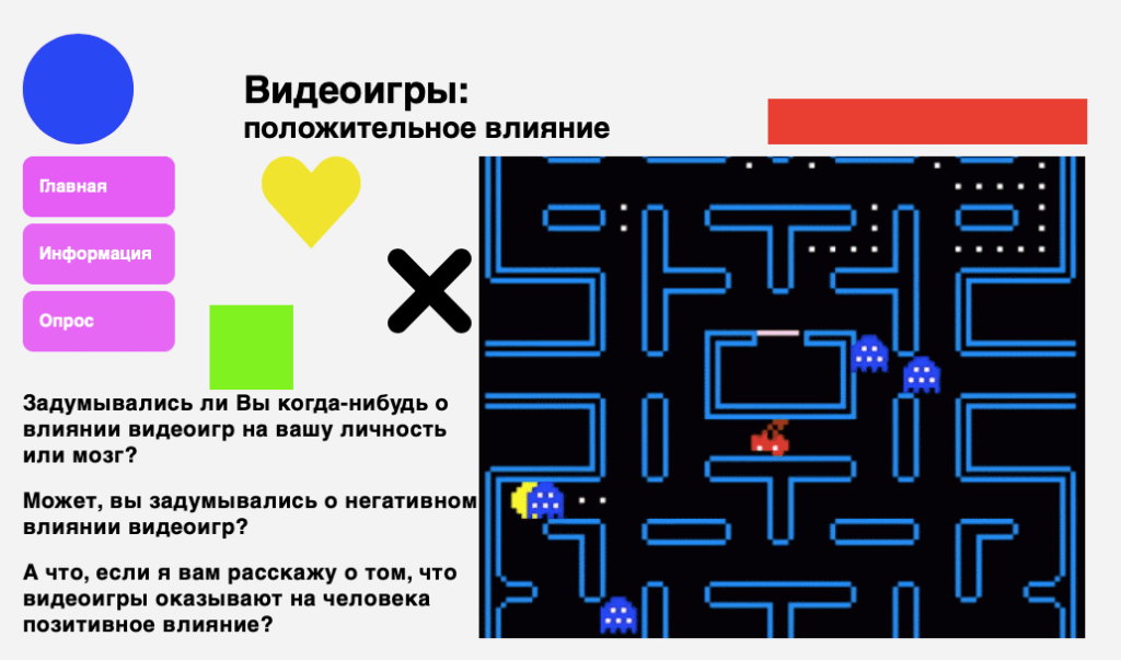 Вы когда-нибудь задумывались о пользе видеоигр? Думаете, что они ничего хорошего не несут? Спорим, что мы сумеем доказать обратное? Точнее не мы, а Катя Иванова из 9 «В» класса. Она создала свой сайт с уникальным дизайном, который разработала сама. На сайте вы можете прочитать информацию о том, как развивалась игровая индустрия. И, разумеется, сможете получить ответ на главный вопрос, который мы тут затронули: видеоигры полезны или вредны?