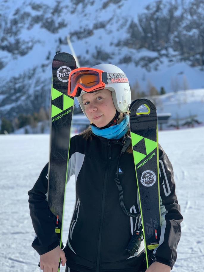 Аня: Для лыж необходимо огромное количество экипировки, особенно для профессиональных. У каждого спортсмена есть как минимум три пары лыж. У топовых спортсменов может быть и по двадцать пар. Ещё, конечно, нужны специальные горнолыжные ботинки. Они определяются по жесткости, она влияет на то, как сильно ботинки будут сопротивляться при давлении. У обычных людей около шестидесяти-семидесяти, у меня сейчас сто тридцать, а у крутых спортсменов бывает и сто семьдесят-сто девяносто. Помимо этого нужно иметь шлем и дугу (штуку, которая защищает от столкновения с вешками). Еще горнолыжная маска, термобельё, обязательно защита для спины (спина – самая травмируемая зона у лыжников), спусковик (специальный костюм, который придаёт обтекаемость телу спортсмена). Ну и куча перчаток!