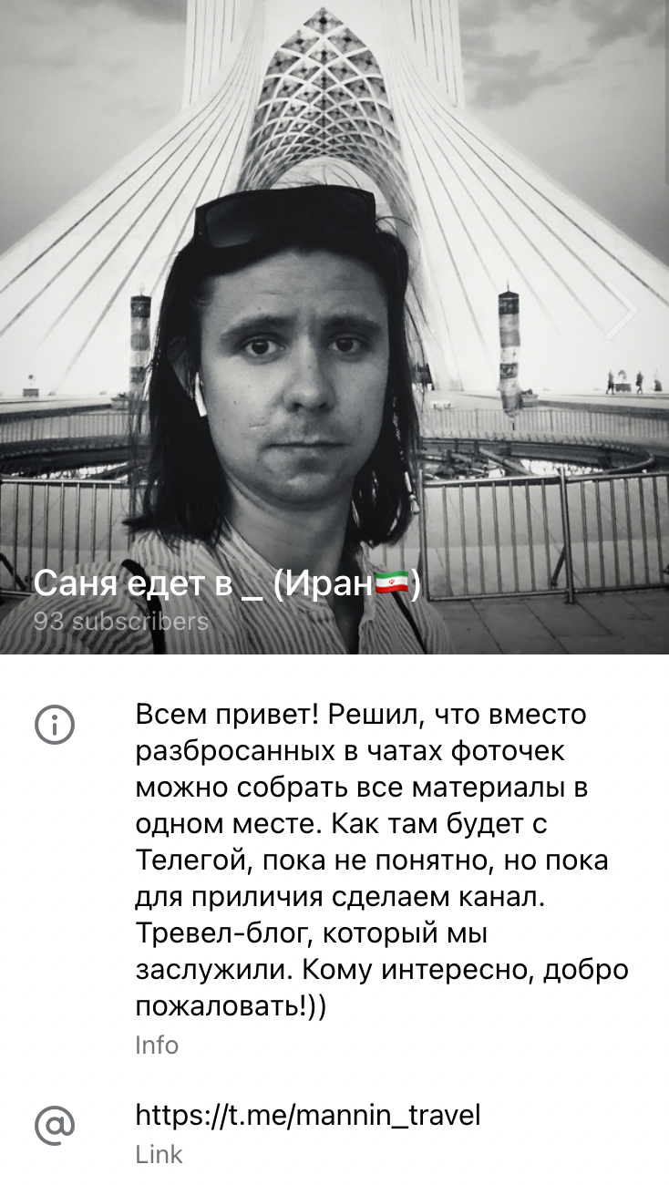 Саша: Во-первых, я много там читал, мне хотелось по-другому взглянуть на культуру, взял своих любимых авторов, много мыслей. Надеюсь, что буду втюхивать темы Иранской культуры своим студентам для исследований. Во-вторых, я впервые вошел в какой-то контакт с социальными сетями. Меня уговорили вести небольшой телеграмм канал про мое путешествие, что для меня непривычно, так как я больше предпочитаю живое общение. И изначально я его завёл для самых близких людей, а сейчас их там девяносто. Прикольно, приятно.