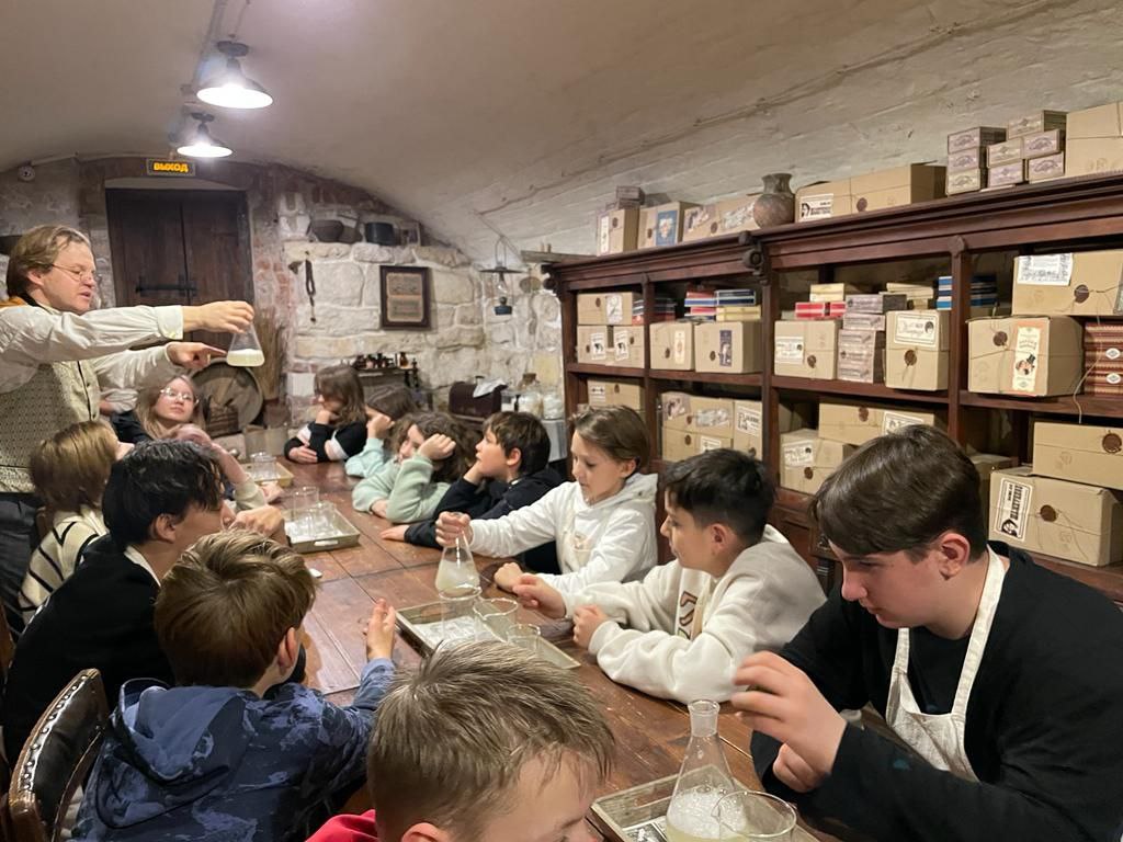 Сама экскурсия проводилась в формате театрального представления. В первой части нам рассказали про появление первого мыла и процесс его изготовления. Мы наблюдали за воздействием жиров, щёлочи и воды. Правда, мы думали, что вот-вот начнём делать мыло, а в итоге просто запаковали готовые продукты.