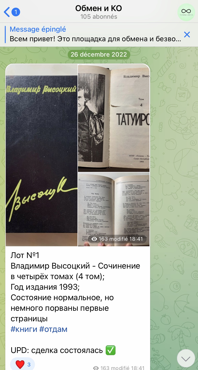 В качестве персонального проекта в девятом классе я создала телеграм-канал для обмена вещами у нас в 45-ой. В нем можно разместить книгу, игрушку, одежду, декор, аксессуары, сувениры – что угодно. Человек, который заинтересуется, пишет в комментариях о желании получить лот – я обмениваю контактами отдающего и принимающего, после чего вы договариваетесь о месте и времени обмена, и всё – сделка состоялась! Вы сделали друг друга чуточку счастливее, а окружающую среду чище. Я уверена, эта площадка будет полезна каждому, и проект останется в школе надолго. Давайте вместе сохранять природу и радовать друг друга!