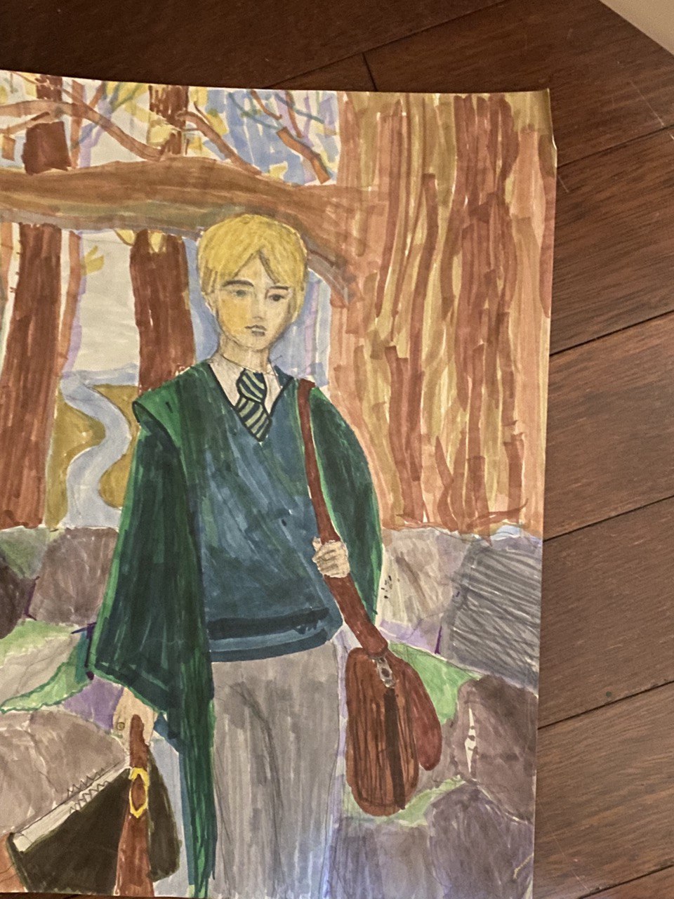 Моя любимая работа… Трудно сказать, у меня их скорее всего 1-2. Первая из них по одному из моих любимых фильмов. Это рисунок Драко Малфоя из фильма «Гарри Поттер». С четырех лет я множество раз посмотрела фильмы о мальчике, который выжил, а книги я не читаю, а глотаю (даже пробовала на английском). Драко – мой любимый персонаж, и я очень люблю эту картину, в ней видно мой первый рывок прогресса. Вторая – это портрет моей няни. Как и у Пушкина, у меня была своя любимая няня. Возможно, я напишу ей стихотворение. Этот человек поддерживал меня во многих моих начинаниях, проводил со мной время. Порой создавалось ощущение, что это не взрослый человек, а твой ровесник. Ее портрет висит на третьем этаже 45 школы.