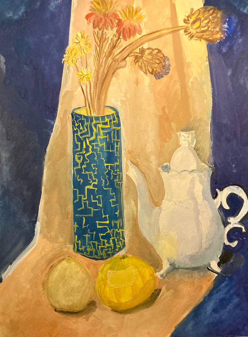 Естественно, мои любимые работы в художественной школе обычно и последние, потому что с каждым годом они становятся лучше! Этот натюрморт – моя первая работа по живописи в этом учебном году. К сожалению, в девятом классе гораздо больше рисунка (графики), чем натюрмортов, а тем более живописных, но чем богаты, тем и рады. Так что на данный момент это мой любимый натюрморт. Я уже вижу некоторые косяки, но надеюсь, что никто кроме меня (а тем более комиссия на просмотре) их не замечают!