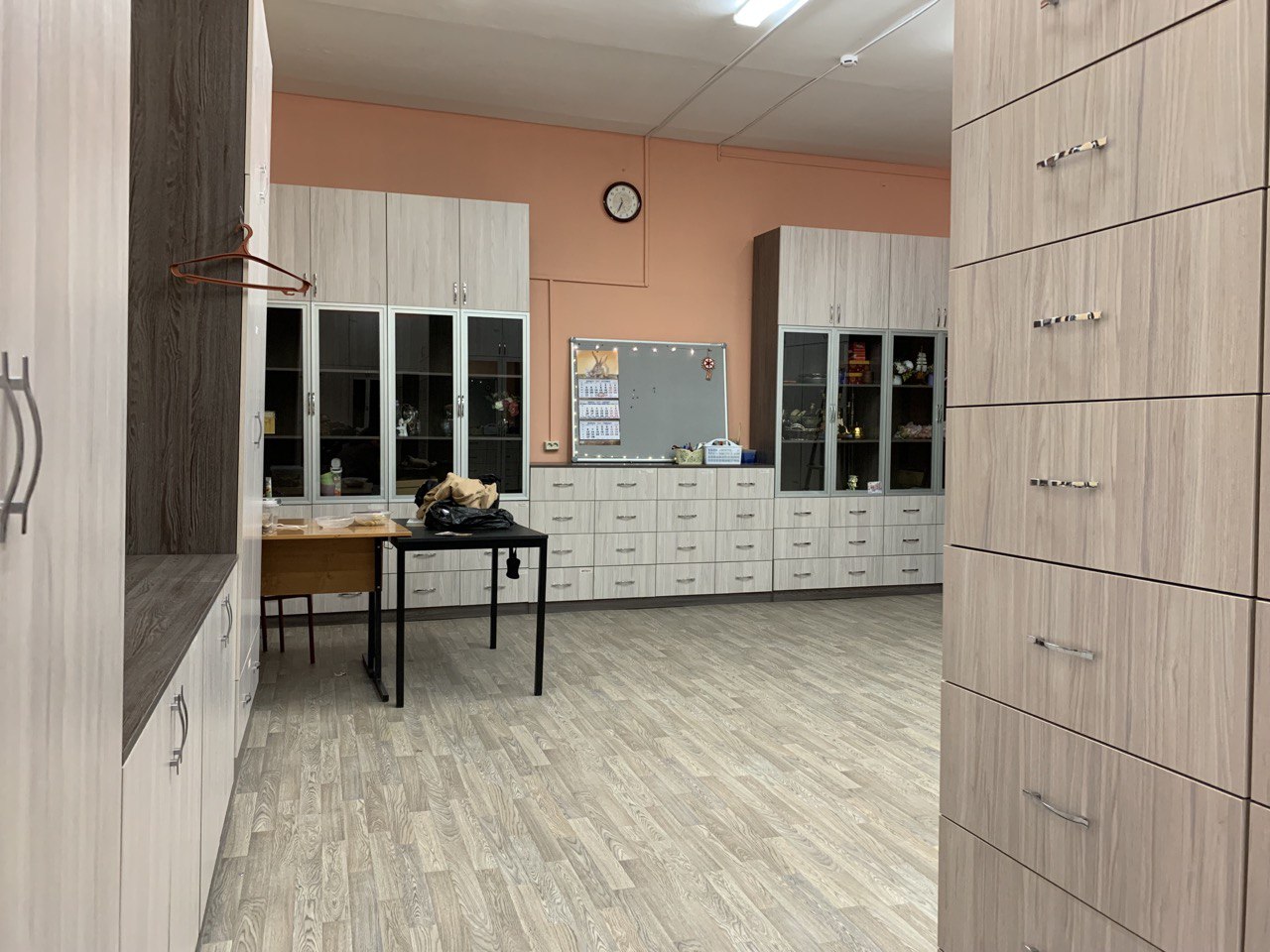 Нельзя не отметить, что работы по переезду было очень много. В течение долгого времени островские бравые парни перетаскивали вещи из старого «Острова» в новый, а девочки помогали Лене раскладывать вещи по нужным местам. Ранее тусклый и унылый кабинет был перекрашен, отремонтирован, заменён старый порванный линолеум. Проектировщики обсчитали и создали для нас план и макеты мебели. Шкафы стали гораздо больше и функциональнее чем были ранее, ведь потолки в 21-м кабинете выше на полтора метра. Для хранения вещей мы старались рационально использовать всё пространство. Мы учли ошибки старой мебели: отказались от раздвижных дверей, которые то и дело ломались; широкие ящики заменили большим числом небольших ящиков, чтобы не проваливалось дно от тяжести гуаши, пластилина и всякой-всячины; рассчитали ширину и высоту полок под размер стандартных контейнеров; и многие другие тонкости, которым нас научил опыт. Цветовое решение мебели (бежево-коричневый) полностью повторяет старый подвал – как минимум для того, чтобы переезд причинил минимум морального вреда и новое помещение оставалось уютным и комфортным для островитян.»