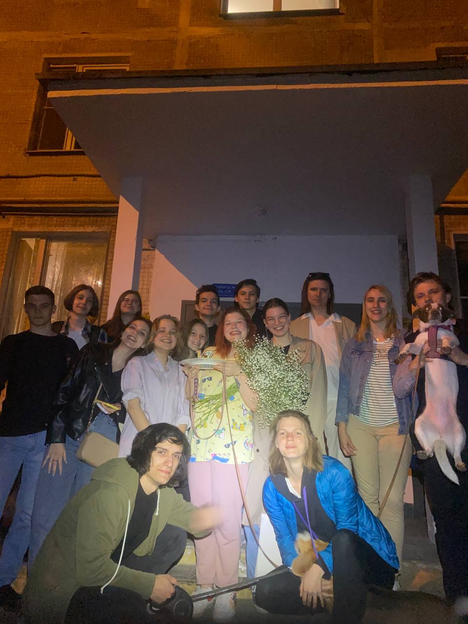 Мне ещё сразу вспоминается моё прошлогоднее поздравление. Вера Лебедева и Соня Рийсман придумали необычный способ меня поздравлять: я должна была ходить по подсказочкам по парку, угадывать людей, подходить к ним. Каждый дарил мне цветочек, и в итоге у меня был большой букетик и куча моих близких людей вокруг! Само празднование мне пришлось перенести на неделю позже, потому что я уезжала в выходные в Воронеж за выпускным платьем.