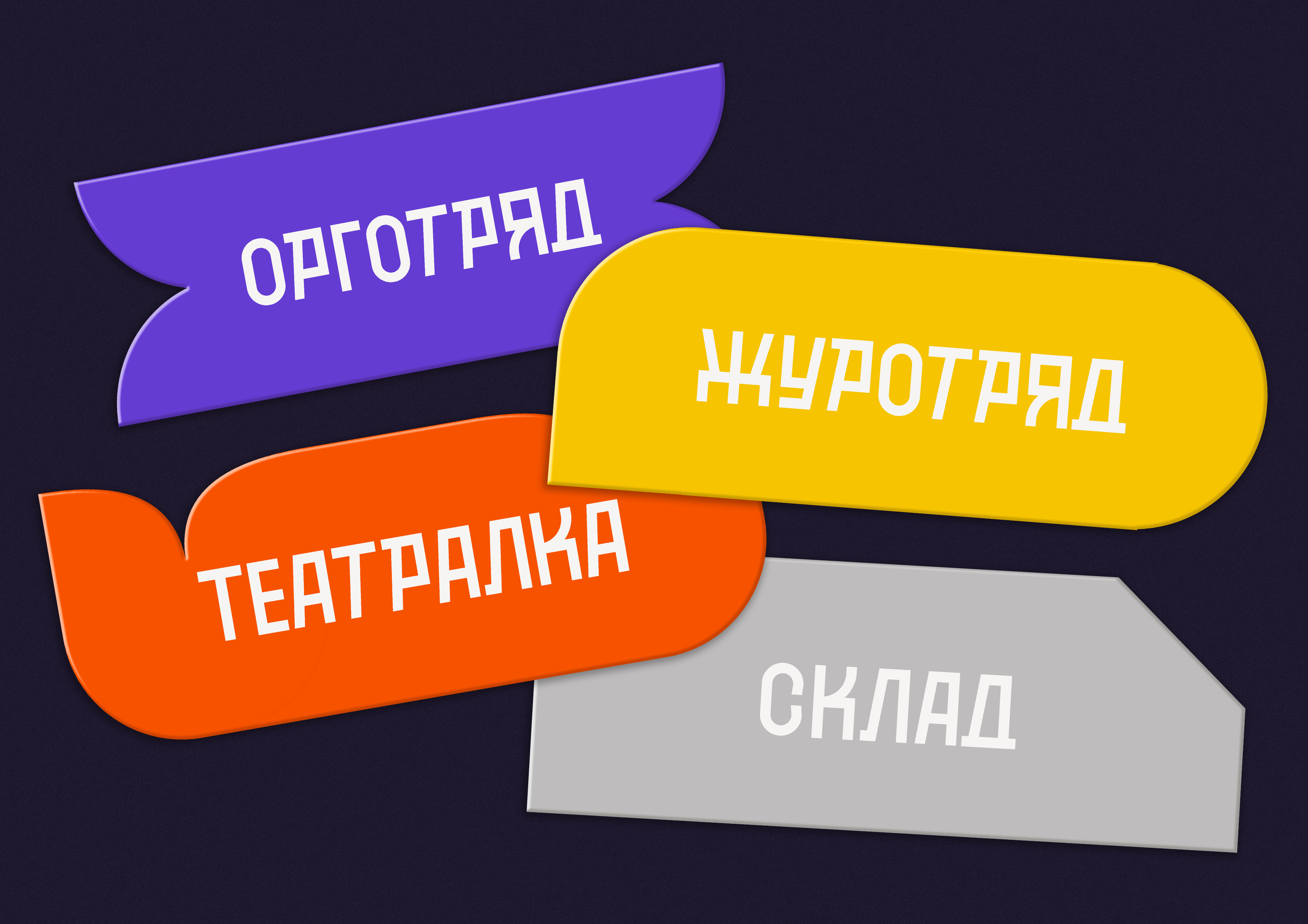 Ксюша: Изначально этот шрифт должен был использоваться только для логотипа, и отрисовала я только необходимые буквы. Но когда началась разработка мерча, мне показалось, что написать слово «инструктор» этим шрифтом будет прикольнее, чем основным (основной шрифт — «Golos»). Затем пришлось отрисовать буквы для табличек отрядных. Резюмируя, алфавит наполовину есть. Если делать реальный наборный шрифт, чтобы им можно было писать все что угодно, нужно очень много времени и сил. Например, для каждой буквенной пары устанавливать конкретные расстояния, анализировать, как все буквы вместе смотрятся, как они между собой взаимодействуют композиционно: по объему и контрасту. Мне не хватило времени этого сделать.