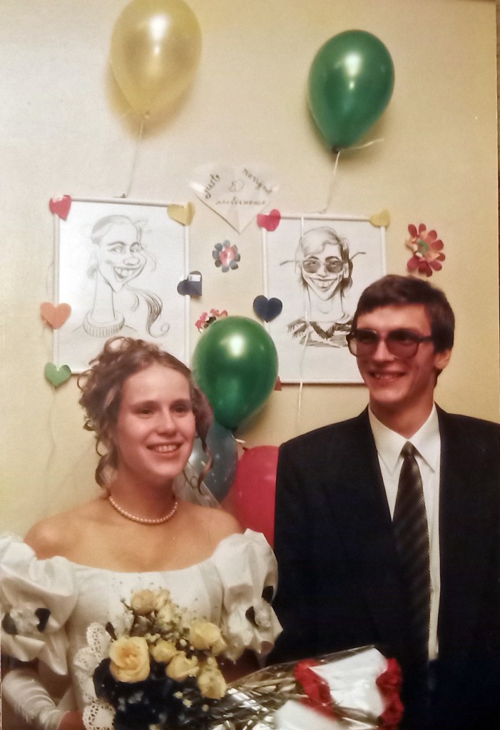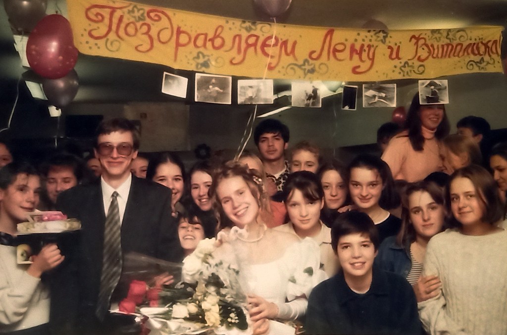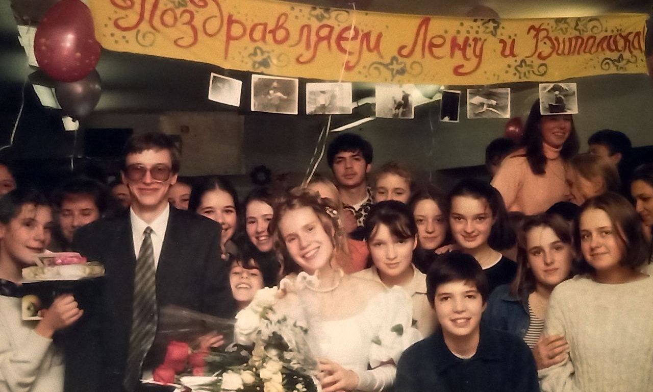 Виталий Викторович: Наша свадьба прошла в октябре 1997 года. Для нас это было очень большое и важное событие. Во-первых, мы очень активные люди, поэтому у нас всегда было много друзей. Во-вторых, у нас большие семьи, поэтому у нас было много родственников. Мы арендовали большой зал, там проходило торжество, где, в том числе, была организована сцена, кроме поздравлений на свадьбе звучало очень много песен. Мы заехали в школу, потому что у нас там было много друзей среди взрослых и детей, а ребята подготовили несколько выступлений-поздравлений, переделали песни под свадебную тематику. Наверное, это и не удивительно, что свадьба осталась ярким воспоминанием.