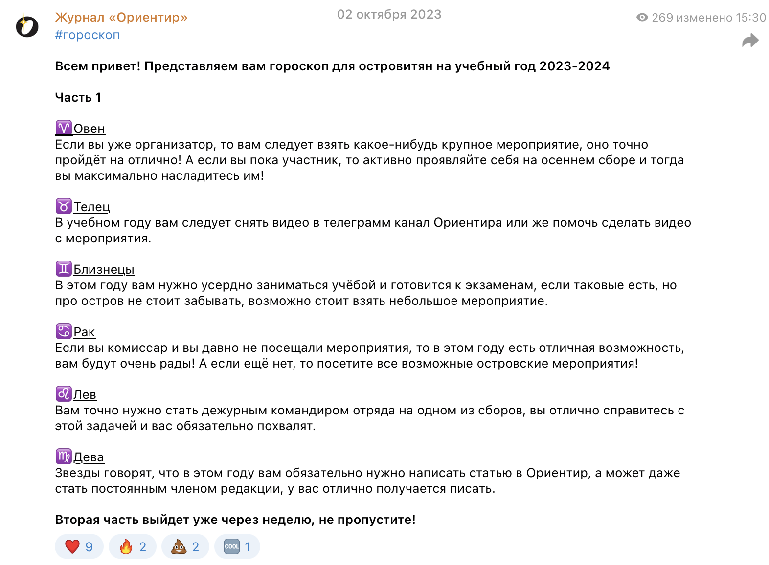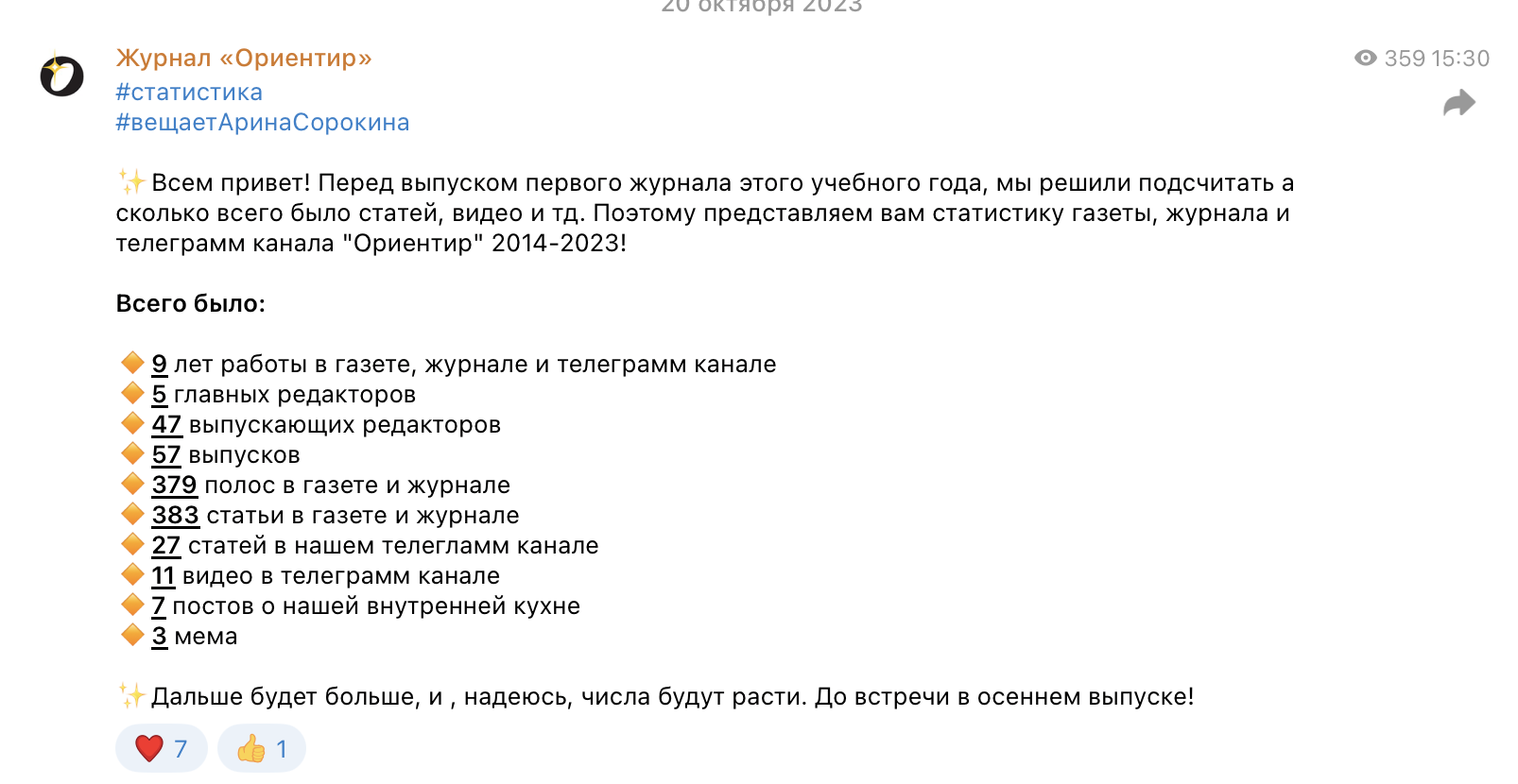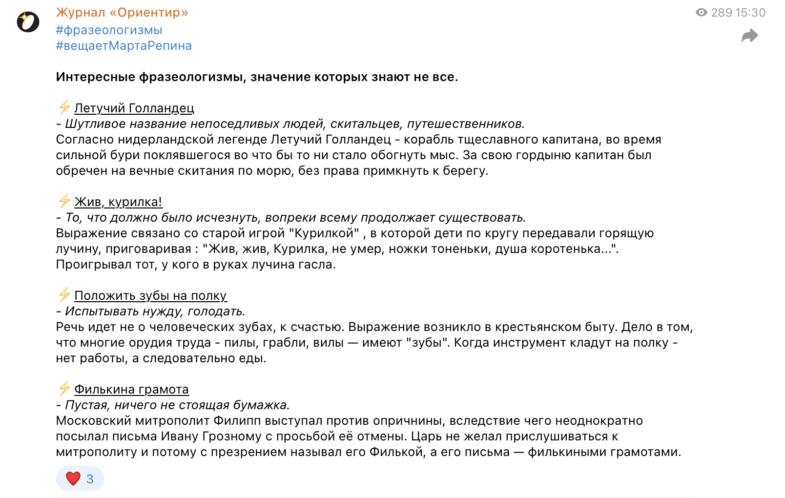 Интересно, что помимо непосредственно журнала, у «Ориентира» есть свой телеграм-канал, где выходят небольшие статьи, опросы, короткие видео, подборки фотографий.