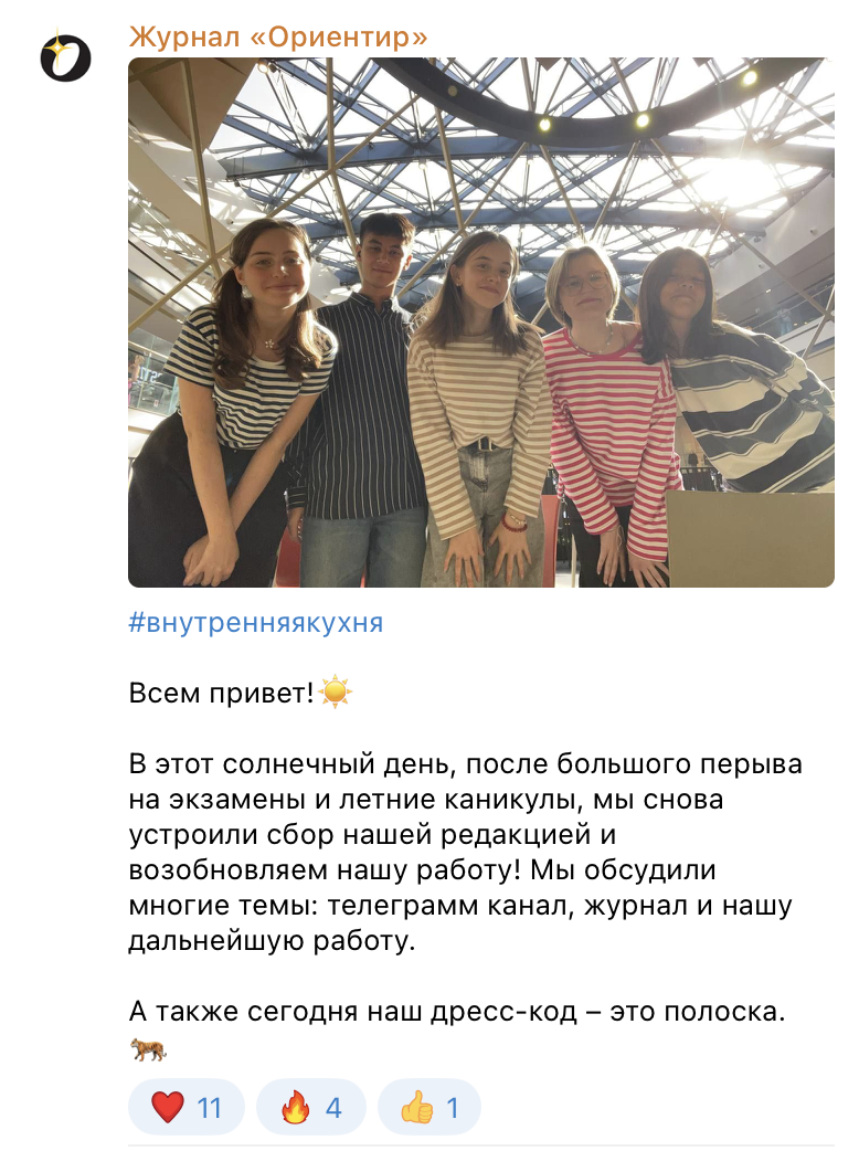 Если следить за телеграм-каналом «Ориентира» становится понятно, что будни редакции проходят очень ярко: тематические планерки, совместные пикники и походы в музеи, прогулки, мастер-классы и т.д. Арина называет это формой тим-билдинга: