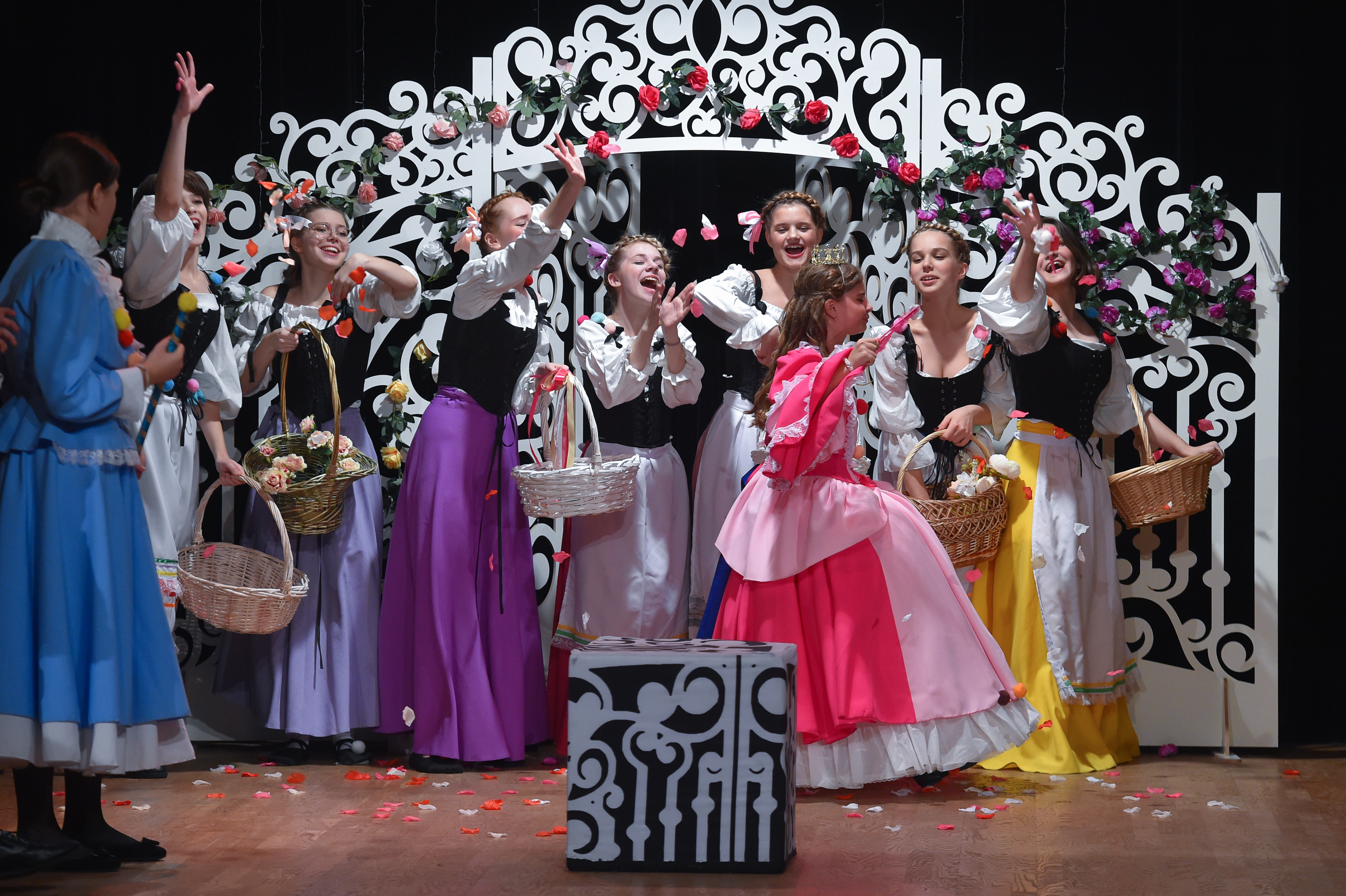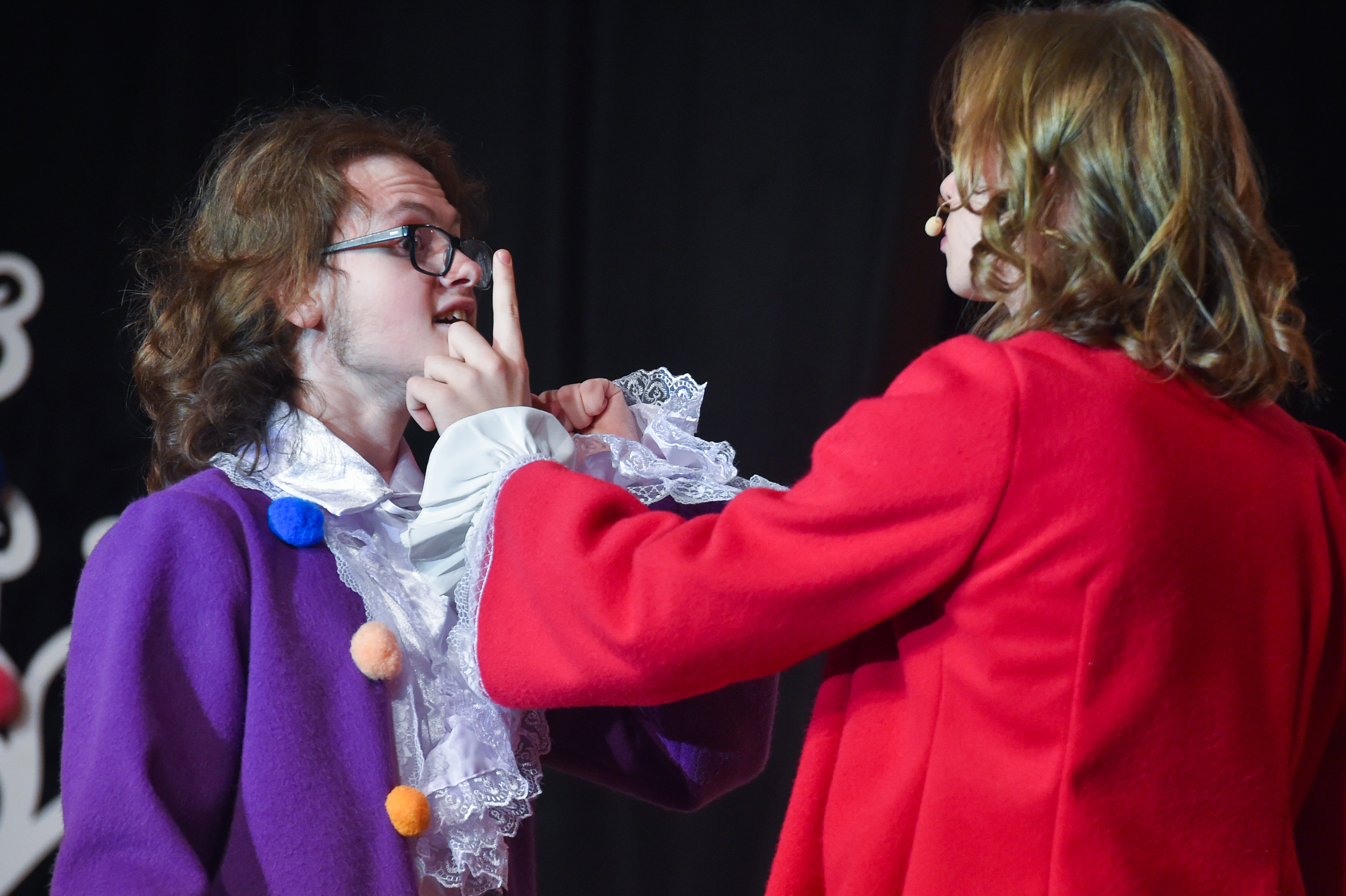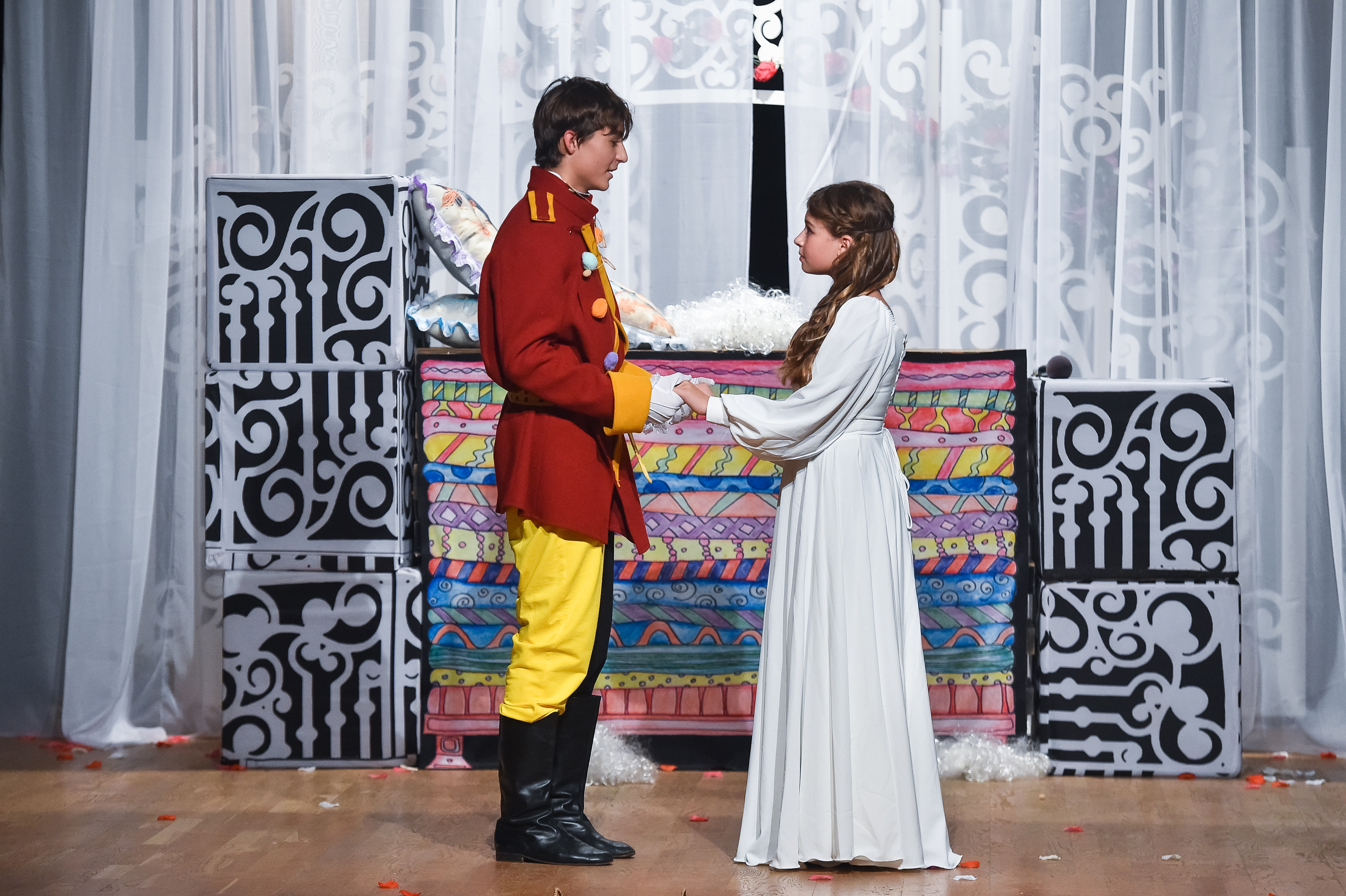 Сюда же отнесу и Машу Гапонову и Егора Шибанова — опять же, наличие «взрослых голосов», которые знают, как надо и могут дать «больше, чем ожидается», делают театральный текст объемнее, полифоничнее, «выпуклее». Вот, скажем, присмотришься к группе фрейлин тех же самых и с улыбкой замечаешь, как много динамики всем остальным передает Маша, как она задает правила взаимодействия остальных, как усиливает общий эффект — круто! Для многих из наших нынешних актеров «Принцесса и Свинопас» — это возможность «прозвучать в новом качестве». Например, я считаю, что роль Христиана для Сережи Медведева очень полезная и важная — где, как не в таком амплуа, научиться «дорабатывать», «заполнять пространство вокруг других», больше следить за этими самыми «другими», а не за собой — путь к «актерскому взрослению. Для кого-то новый спектакль — возможность «вообще прозвучать впервые». В этом плане очень здорово и интересно смотреть за Федей Лаврищевым, исполнившим роль Короля-жениха, для которого, как ощущается «из-за пределов сцены» этот спектакль стал очень важным и очень нужным опытом — видно, как Федя побеждает своего «внутреннего дракона стеснения», подбадриваемый и вдохновляемый желанием играть, много в этом искренности и честности. Впрочем, до конца оценить, чем же стал спектакль для всех актеров из дня сегодняшнего, как всегда бывает со спектаклями Лены, трудно — многие из них (например, ребята, исполнившие роли поросят) еще даже не перешли в среднюю школу. Как знать, может быть кто-нибудь из них будет играть главные роли в не таком уж далёком будущем…