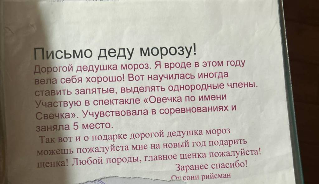 В 4 классе я всю жизнь очень просила родителей купить нам собаку. И вот тут снова наступает Новый год! Я в очередной раз пишу Деду Морозу письмо о том, что очень хочу щенка! Я вообще писала их каждый год и каждый год мне примерно дарили то, что я написала (поэтому я искренне верила в Деда Мороза!) И вот в очередной Новый год я прошу не какую-нибудь игрушку, а целого щенка! Мои родители всегда были против, потому что считали, что мы с братом не справимся с собакой!