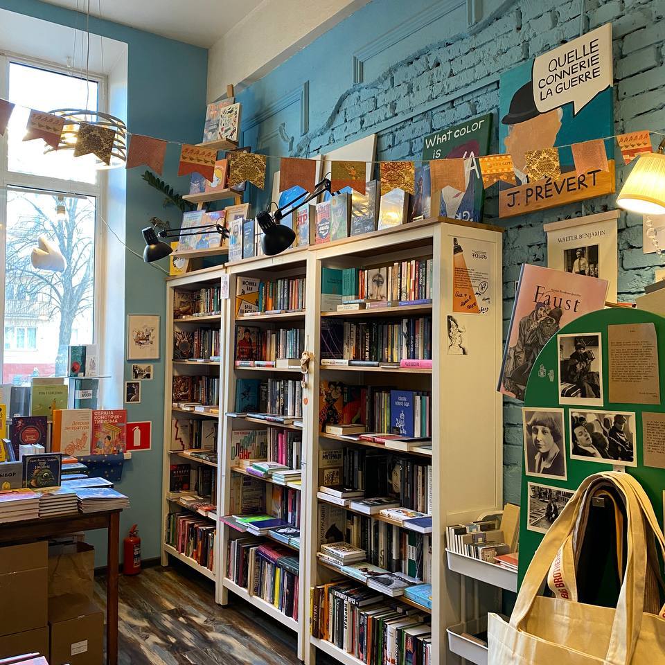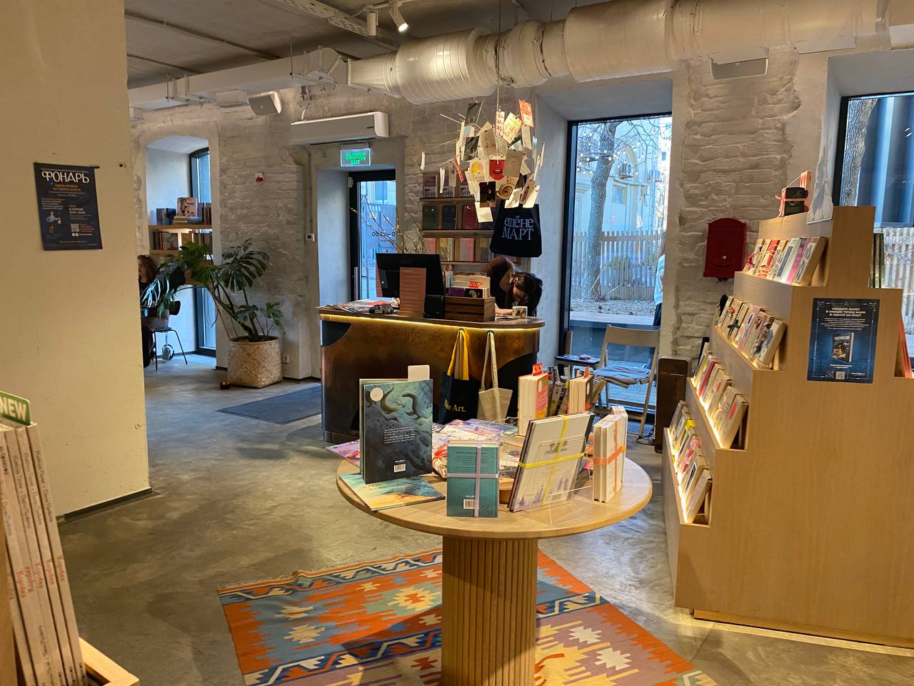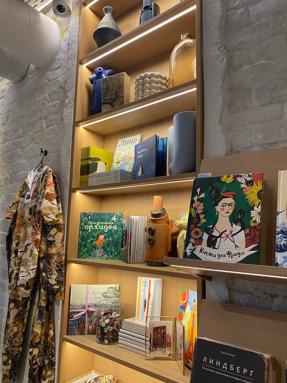 Следующая точка — небольшой магазин с красивым оформлением и расслабленной, немного, пожалуй, джазовой атмосферой. Он существует уже 20 лет. Здесь можно найти множество книг — про искусство, философию и другие гуманитарные науки, детскую и художественную литературу, а также множество сувениров. Рядом находится дом чая и мороженого «Чайная высота», где приятно посидеть, полистать книги и насладиться чаем.