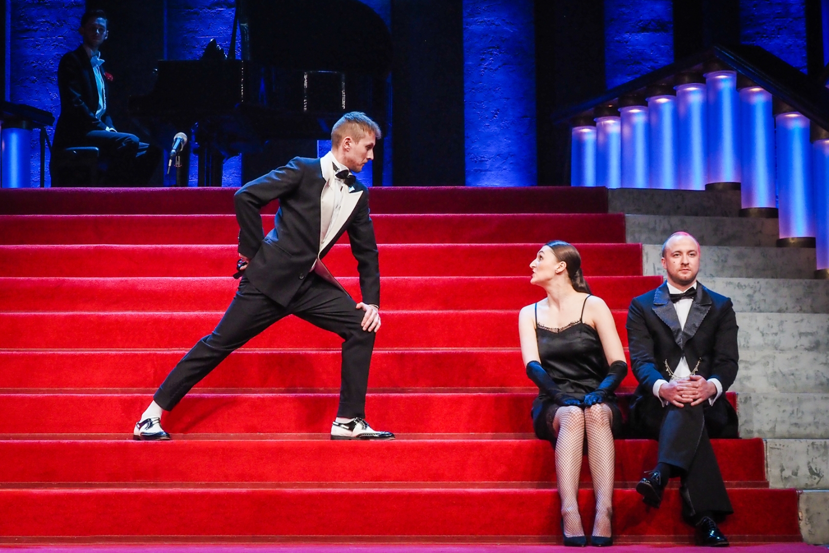 Музыка тоже становится выразительным инструментом. На Таганке постановка открывается аккордами Максима Трофимчука, который весь спектакль сидит за роялем и сопровождает действие — словно музыка становится фоном существования персонажей, постоянным напоминанием о том, что они выступают на сцене кабаре.