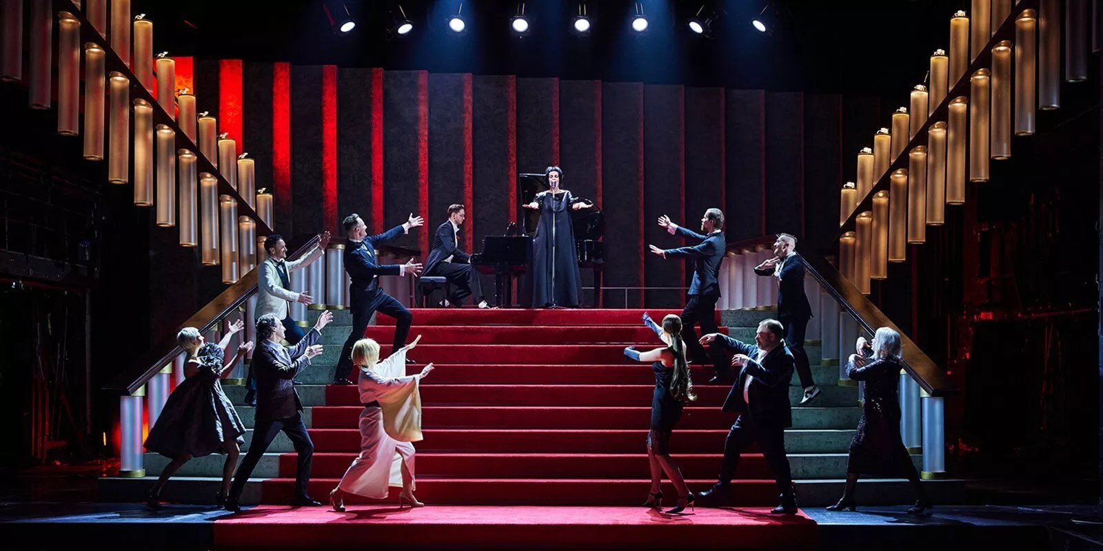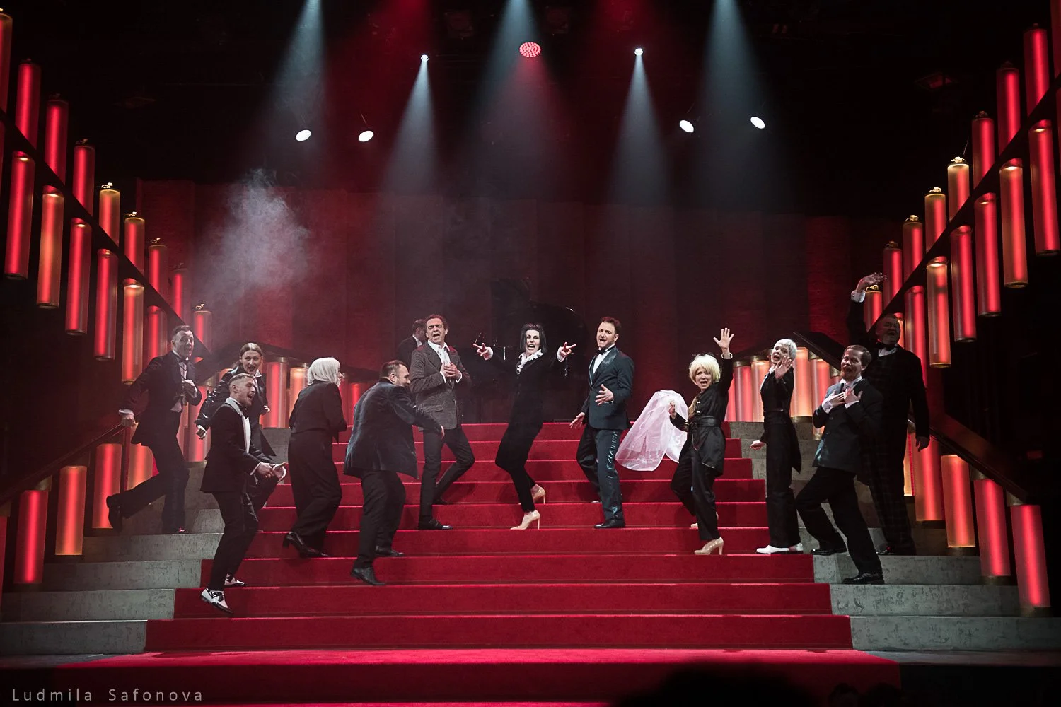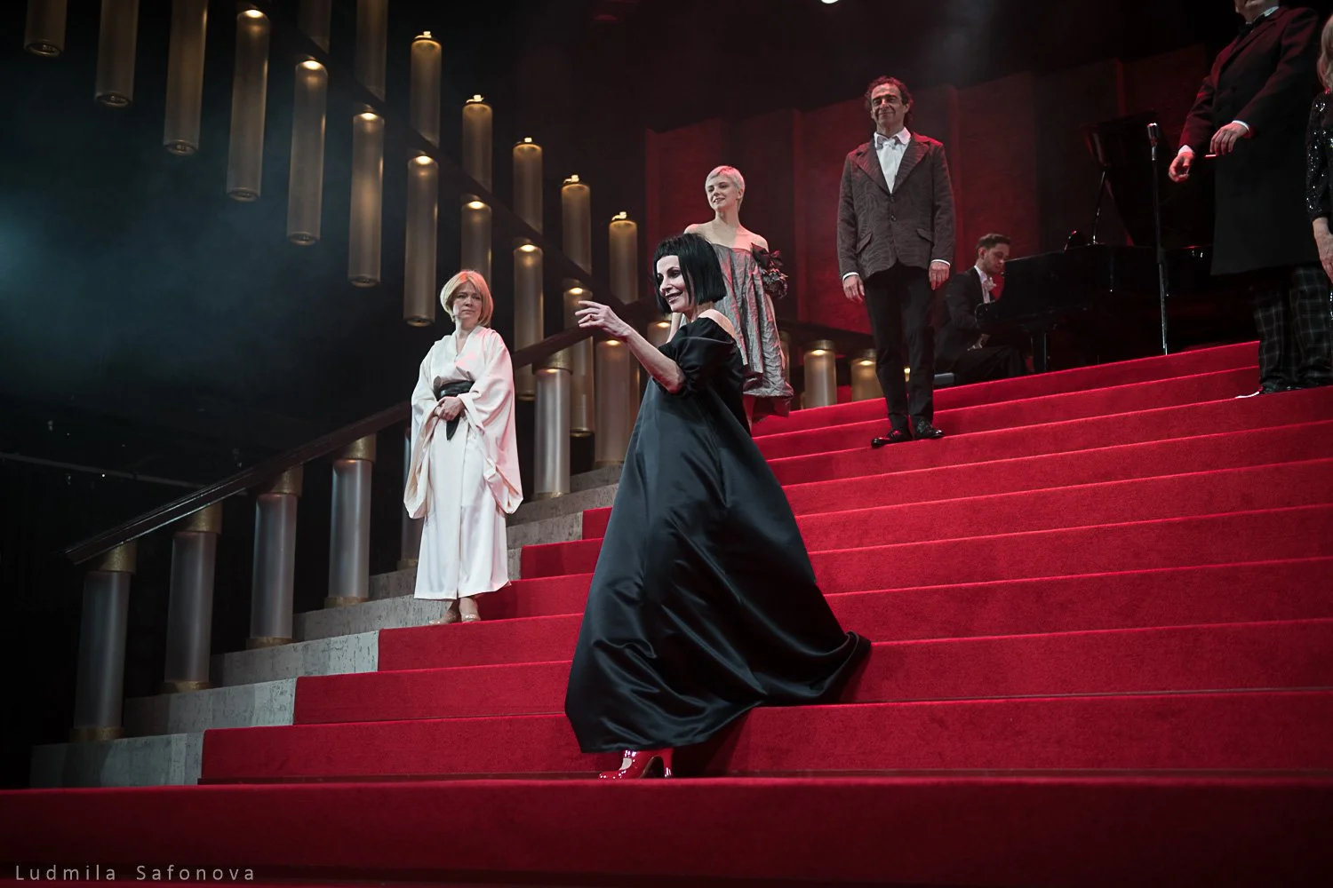 Юрий Муравицкий помещает всё действие в прихожую, оформленную как кабаре: парадная лестница, застеленная красной дорожкой, пианист в смокинге, микрофон, до которого стремятся дотянуться все герои. Эта обстановка придаёт спектаклю атмосферу пафоса и демонстративной театральности: каждый выход напоминает эффектный номер, каждый жест подчеркнут прожектором.