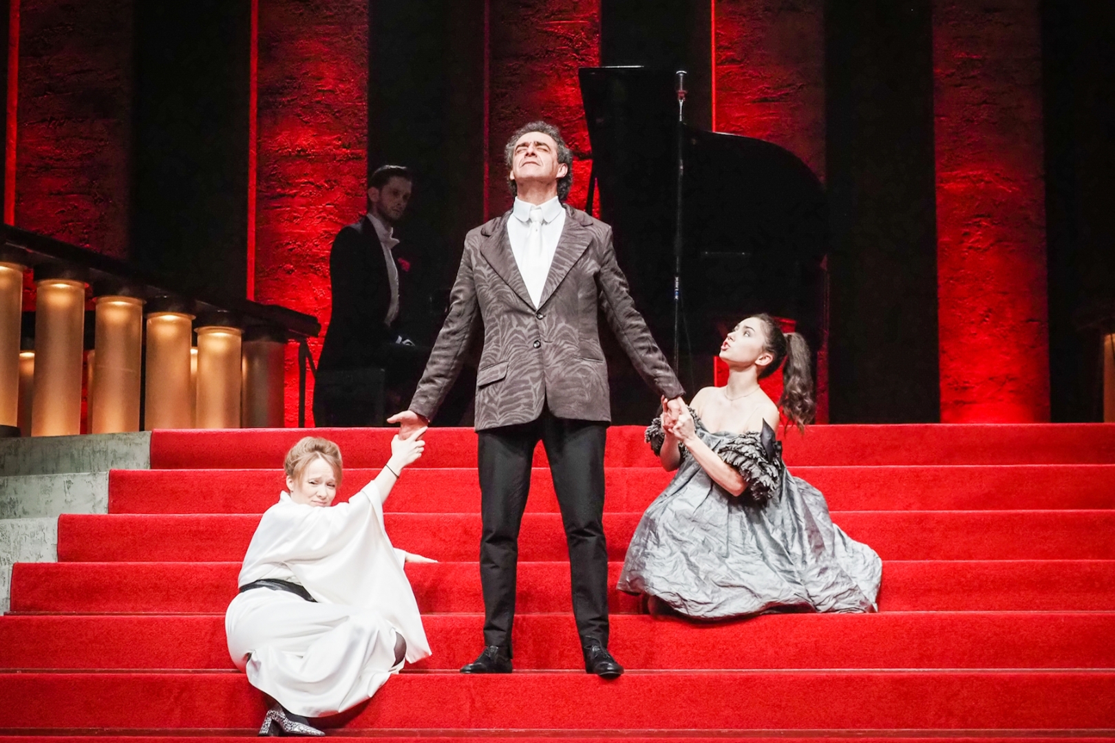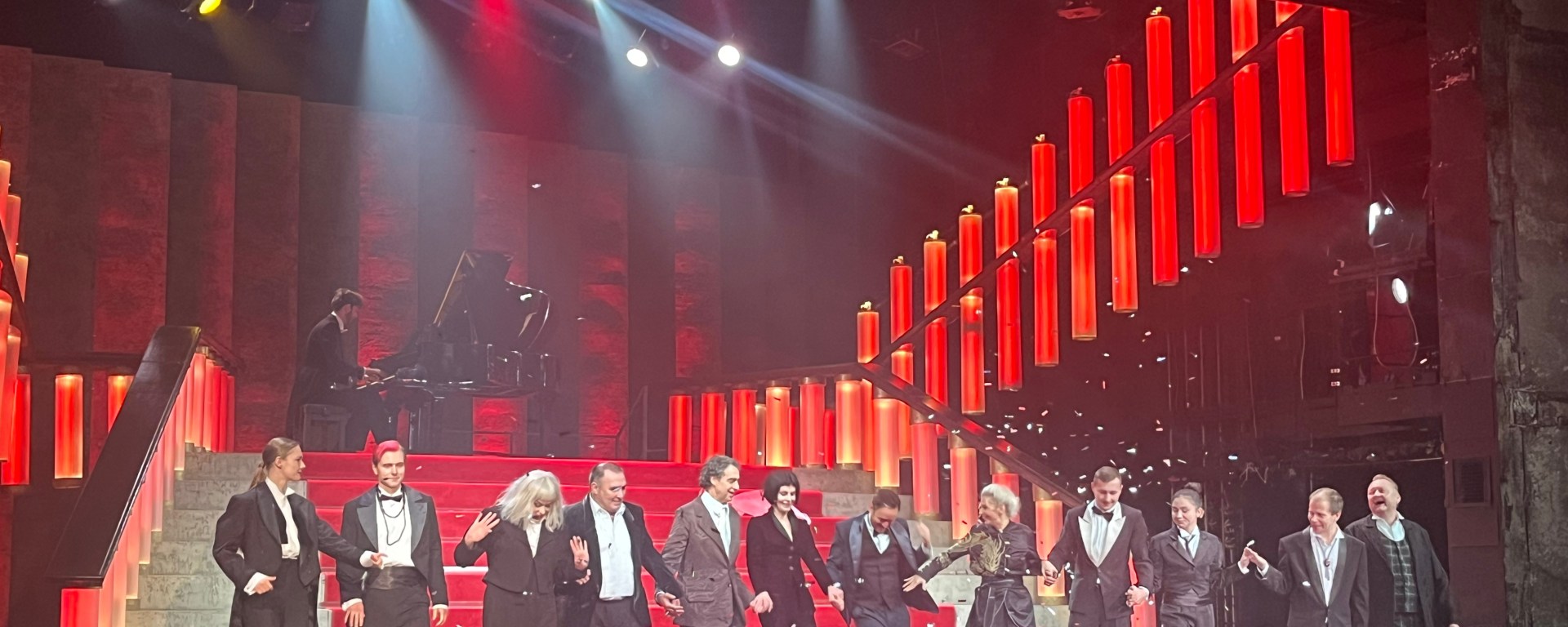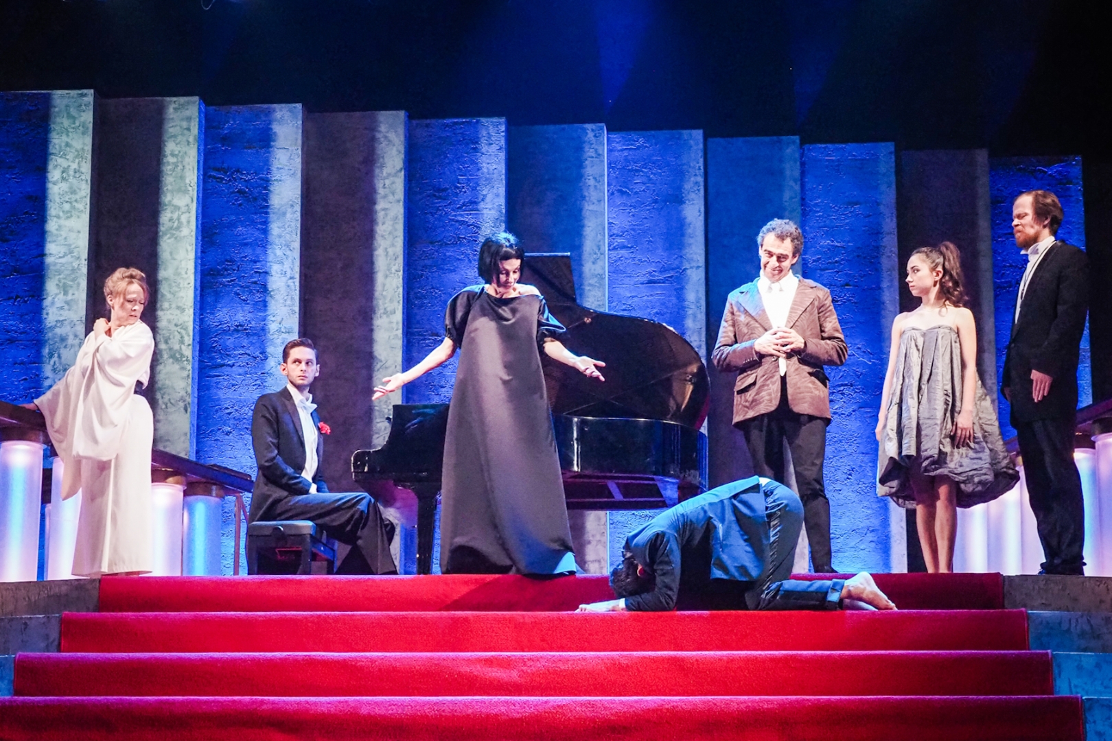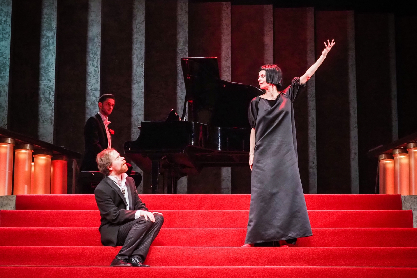 Юрий Муравицкий помещает всё действие в прихожую, оформленную как кабаре: парадная лестница, застеленная красной дорожкой, пианист в смокинге, микрофон, до которого стремятся дотянуться все герои. Эта обстановка придаёт спектаклю атмосферу пафоса и демонстративной театральности: каждый выход напоминает эффектный номер, каждый жест подчеркнут прожектором.