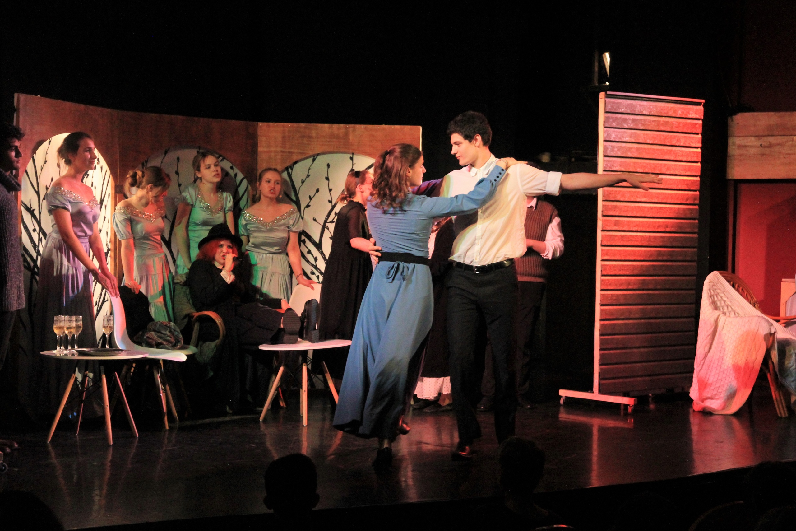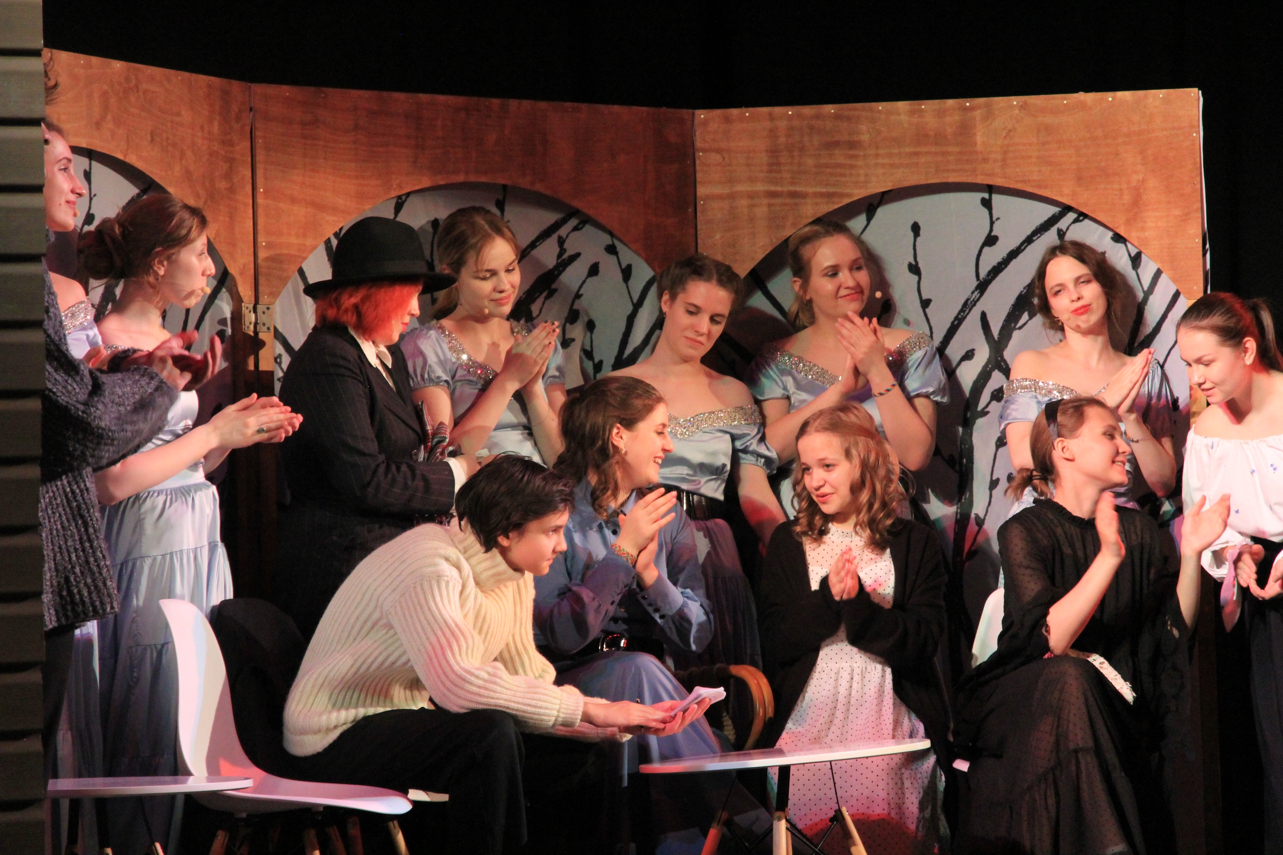 Саша Маннин же выбирает путь исторической стилизации. На школьной сцене появляются кресла-качалки, резные деревянные двери, тканевые задники, имитирующие сад. Декорации не перегружены деталями, но их достаточно, чтобы зритель ощутил дыхание эпохи и пространство уходящей усадьбы.