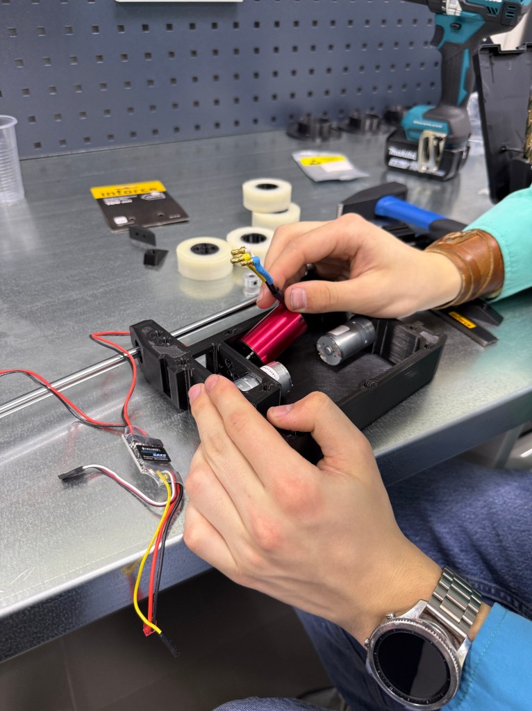 Стёпа: Главная задача робота – уничтожить остальных роботов на ринге и не упасть в нокаут самому. Нокаут в данном случае – это ситуация, в которой робот не может двигаться в течение 10 секунд. Есть много разных способов уничтожения, для него используется оружие, установленное на роботов. Также в этом году на арене появились нововведения в виде активных элементов. Всего их три: лопата, которая подбрасывает робота, свёрла, расположенные у края арены и крутящиеся с большой скоростью, и молоток, который бьёт по роботу, если тот под ним окажется. Для уничтожения других роботов мы будем использовать барабан, вращающийся со скоростью 15000 оборотов в минуту. Наша работа оценивается по трём критериям: количеству нанесённого урона, маневренности и агрессивности.