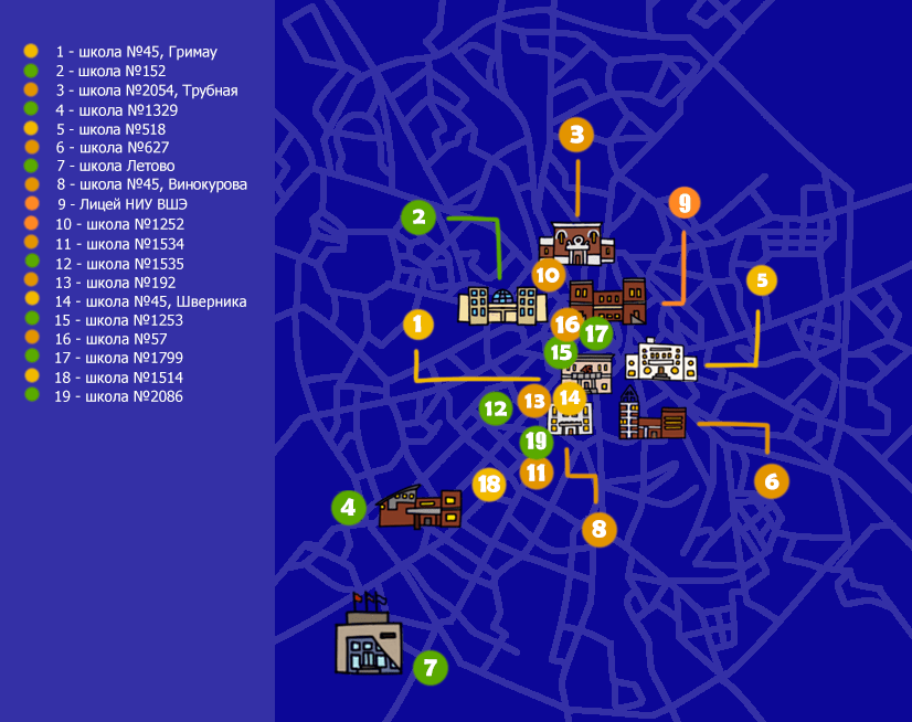 Взгляните на эту карту Москвы: Маруся и Алёна Давыдовы учатся в «Летово», Алена Агеева, Юра Саленко, Серёжа Медведев и Костя Вартанов — в Лицее НИУ ВШЭ, а Гриша Шейнгайт, Ваня Гультяев и Вася Тиунов — в 57-й школе. Это лишь часть мест, куда «разбежались» островитяне. По нашим подсчётам, в Школе №45 учится всего 70 человек, которые участвуют в мероприятиях «Острова». Все остальные проводят свои будни в других учебных заведениях.