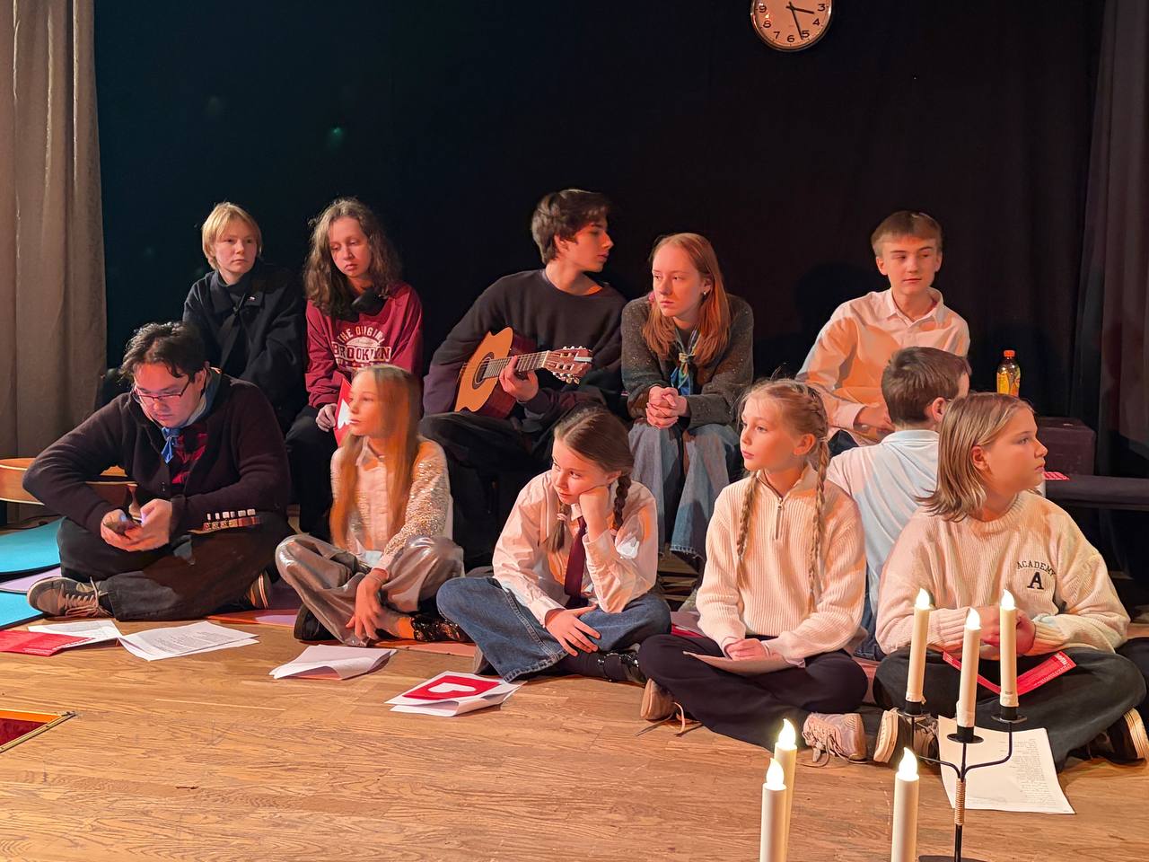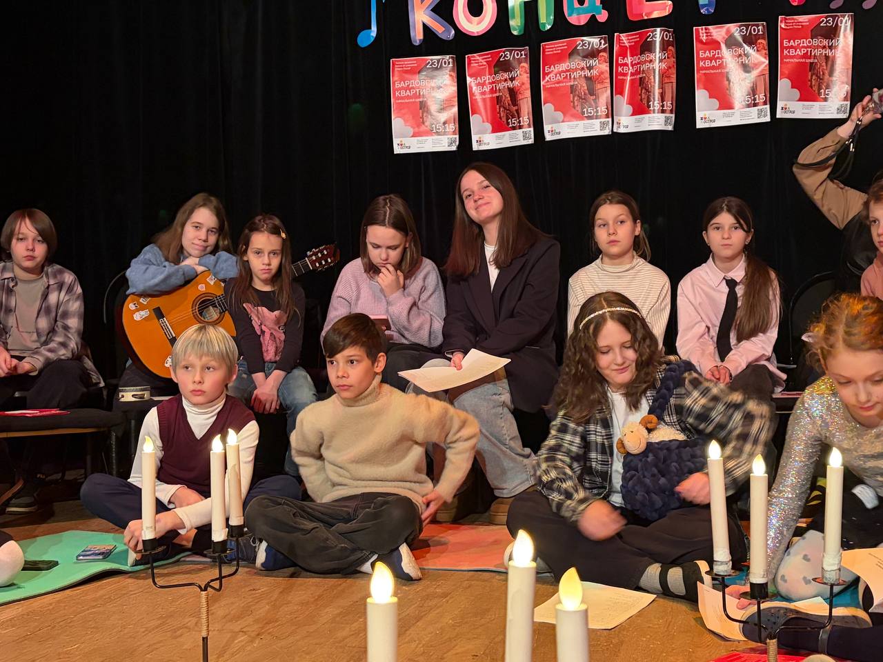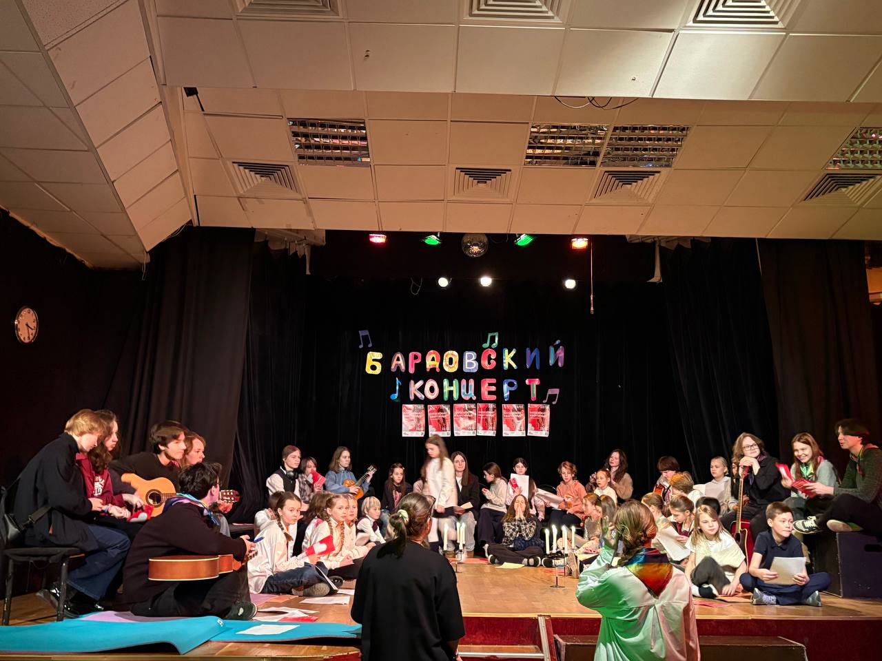 Лена: Так как мы не отбирали детей, проявили желание все. Мы промахнулись по сложности песен, поэтому у многих детей не получалось попадать в ноты. Изначально концерт должен был проходить в ноябре в формате обычного бардовского концерта. Из-за театрального фестиваля и других обстоятельств у гитаристов и детей не было достаточно времени для того чтобы отрепетировать номера. Хотелось, чтобы у всех осталось приятное впечатление, поэтому мы решили, что если посадить всех в круг, то не будет слышно фальшивого пения и это будет звучать приемлемо.